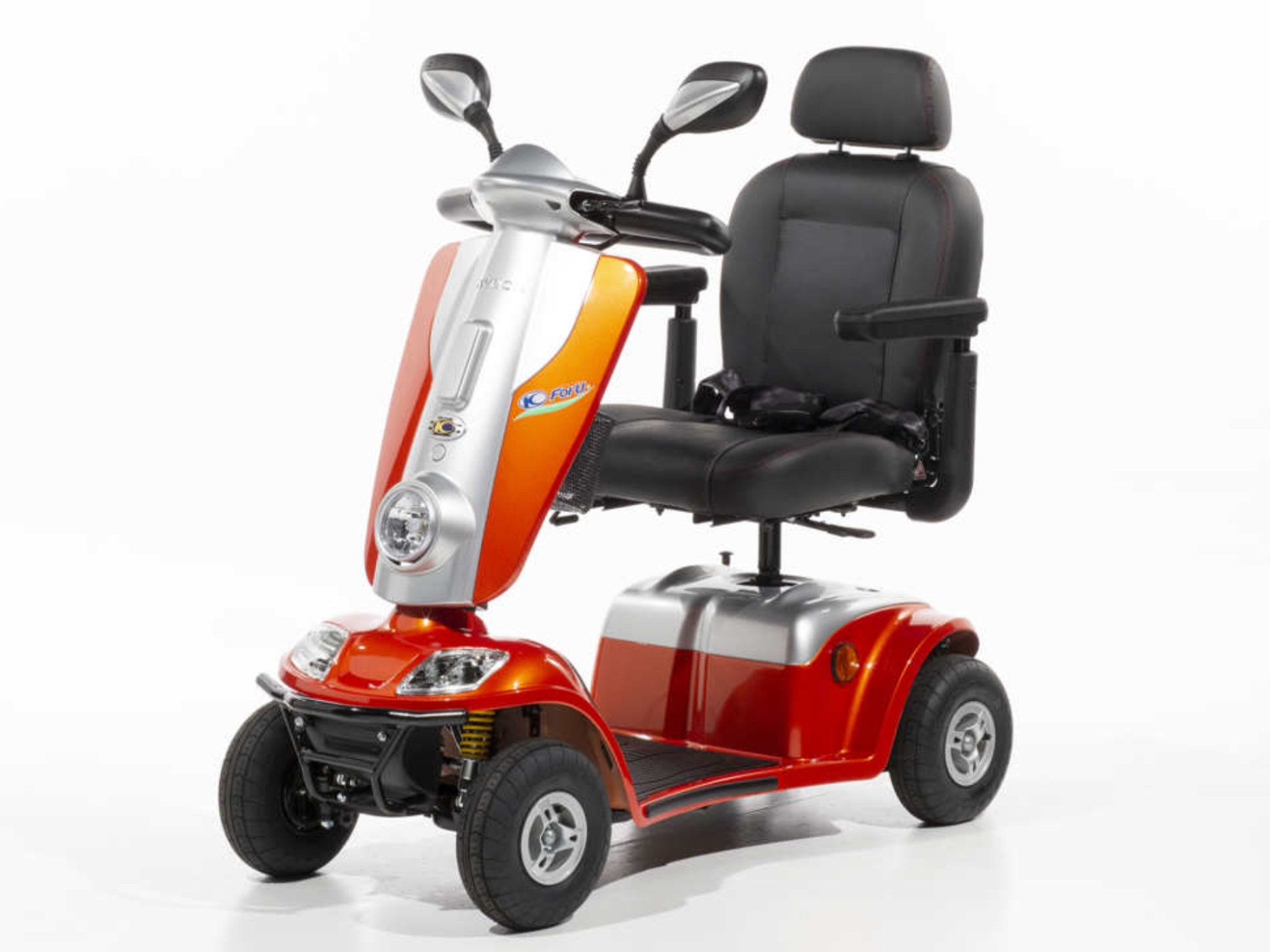 Pre-loved Kymco Agility scooter. 8mph with up to 25-mile range. Max user weight 26 stone (165kg). Size: 1280 x 575 x 1100mm. 12" pneumatic tyres, 50Ah battery, lights fitted. Turning radius 1560mm, max slope 12°. Comfortable, reliable everyday scooter available in a range of colours. Prices starting from £1,750.